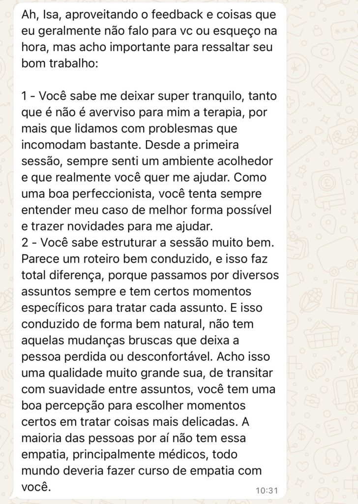 Eu sou Isabella Fontenelle (CRP 11/22261), psicóloga com atuação em psicoterapia online. Atendo principalmente adultos que vivem com ansiedade, perfeccionismo e sinais de burnout — pessoas que se cobram muito, têm dificuldade de descansar e sentem que o trabalho ocupa a mente o tempo todo.